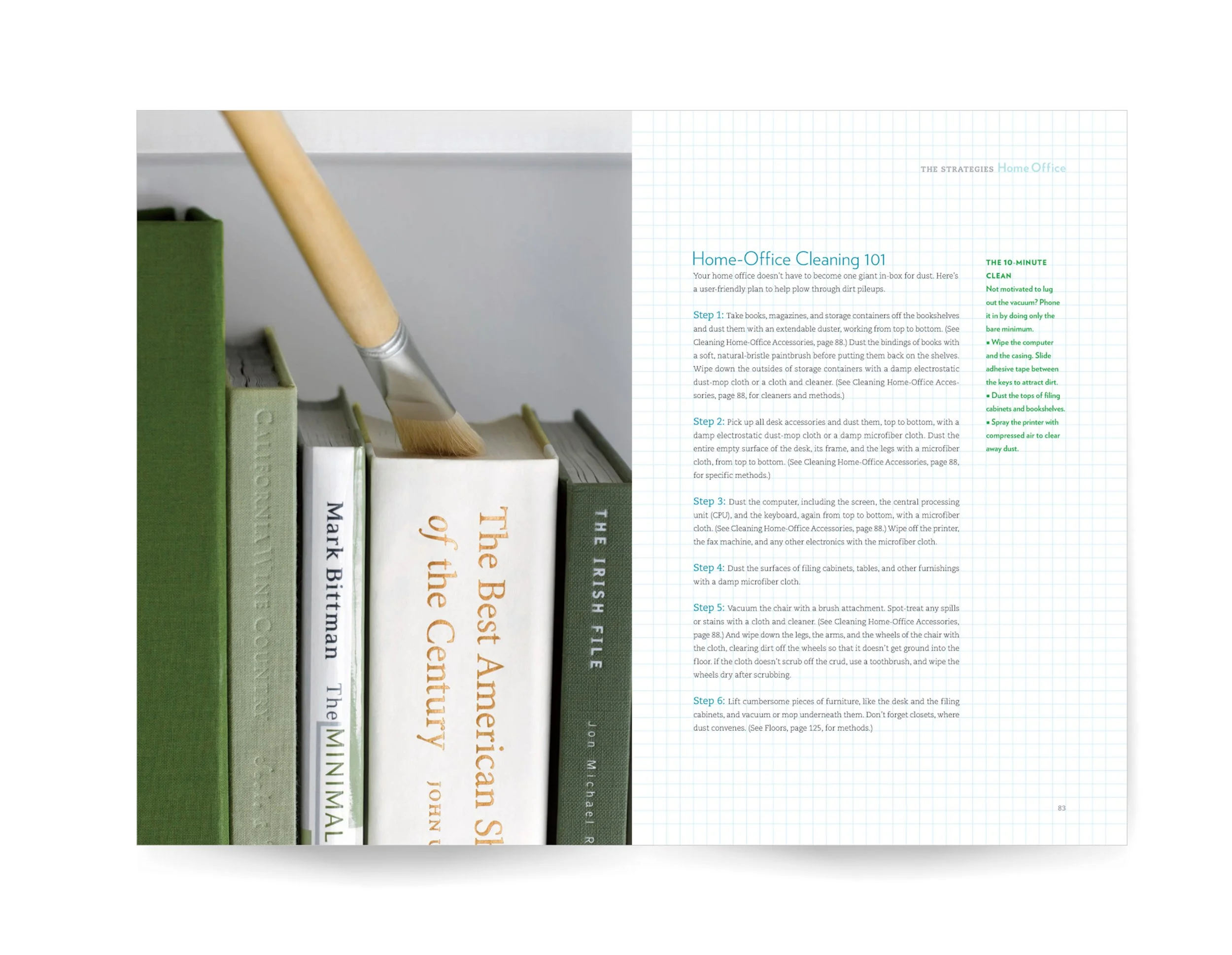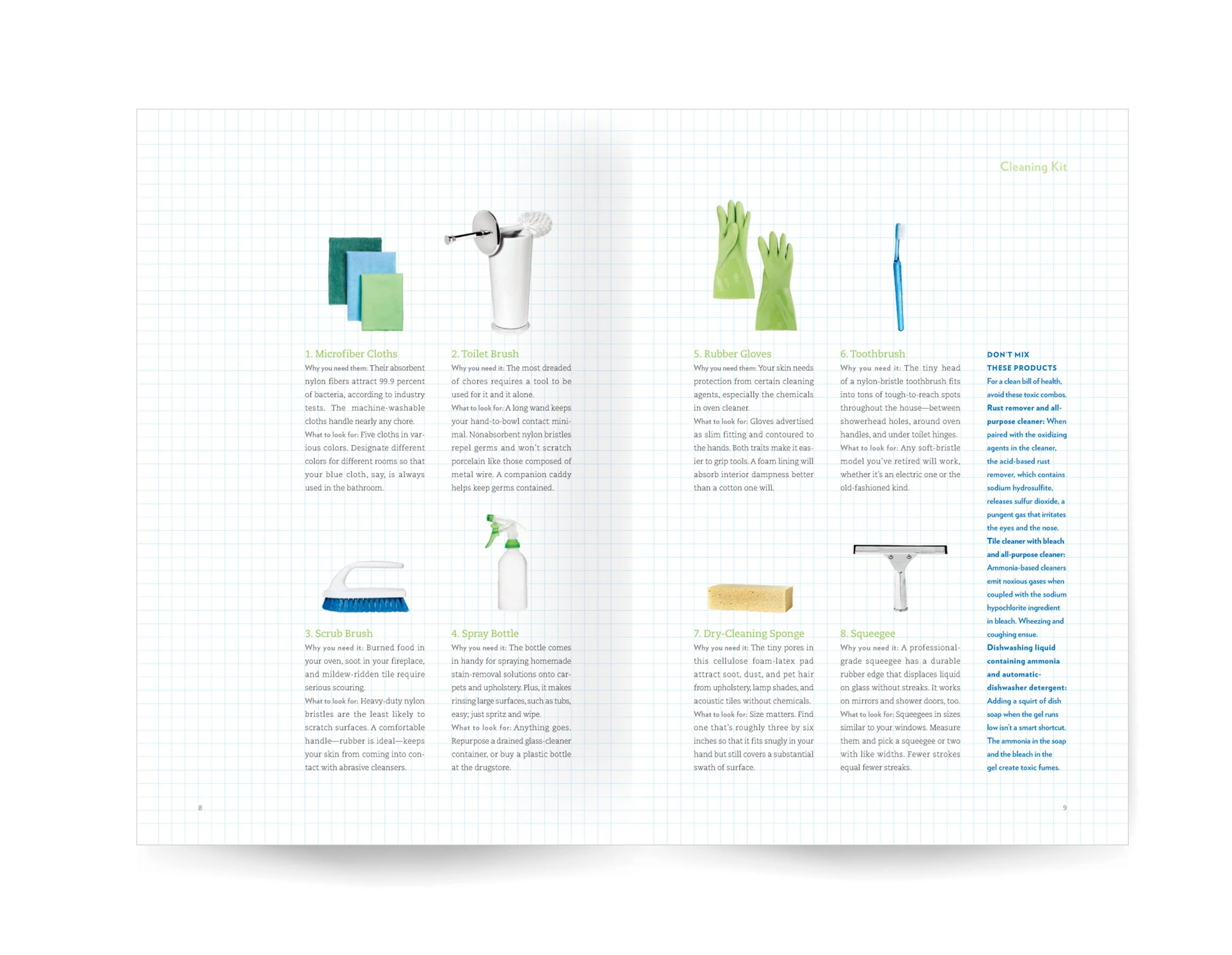 REAL SIMPLE CLEANING I loved the idea of this simple cleaning book, breaking down the dirtiest home-cleaning jobs into manageable tasks, into a room-by-room handbook. When designing the pages, we incorporated a grid graph paper background to help present step-by-step techniques and strategies. This gave the affect of a “workbook” for the reader to use for cleaning a healthy home. The structure helped encompass tips on tools and products to keep on hand, troubleshooting hints for stubborn stains and dirt, speed-cleaning recipes and advice on furnishings, fabrics, walls, and flooring. Both a spiral-bound book as well as a bookazine were published. Design Director: Eva Spring I Art Director + Designer: Michele Walthers I Photographer: Monica Buck I Cover Prop Stylist: Michele Walthers I Prop Stylist : Philippa Brathwaite I Photo Director: Naomi Nista