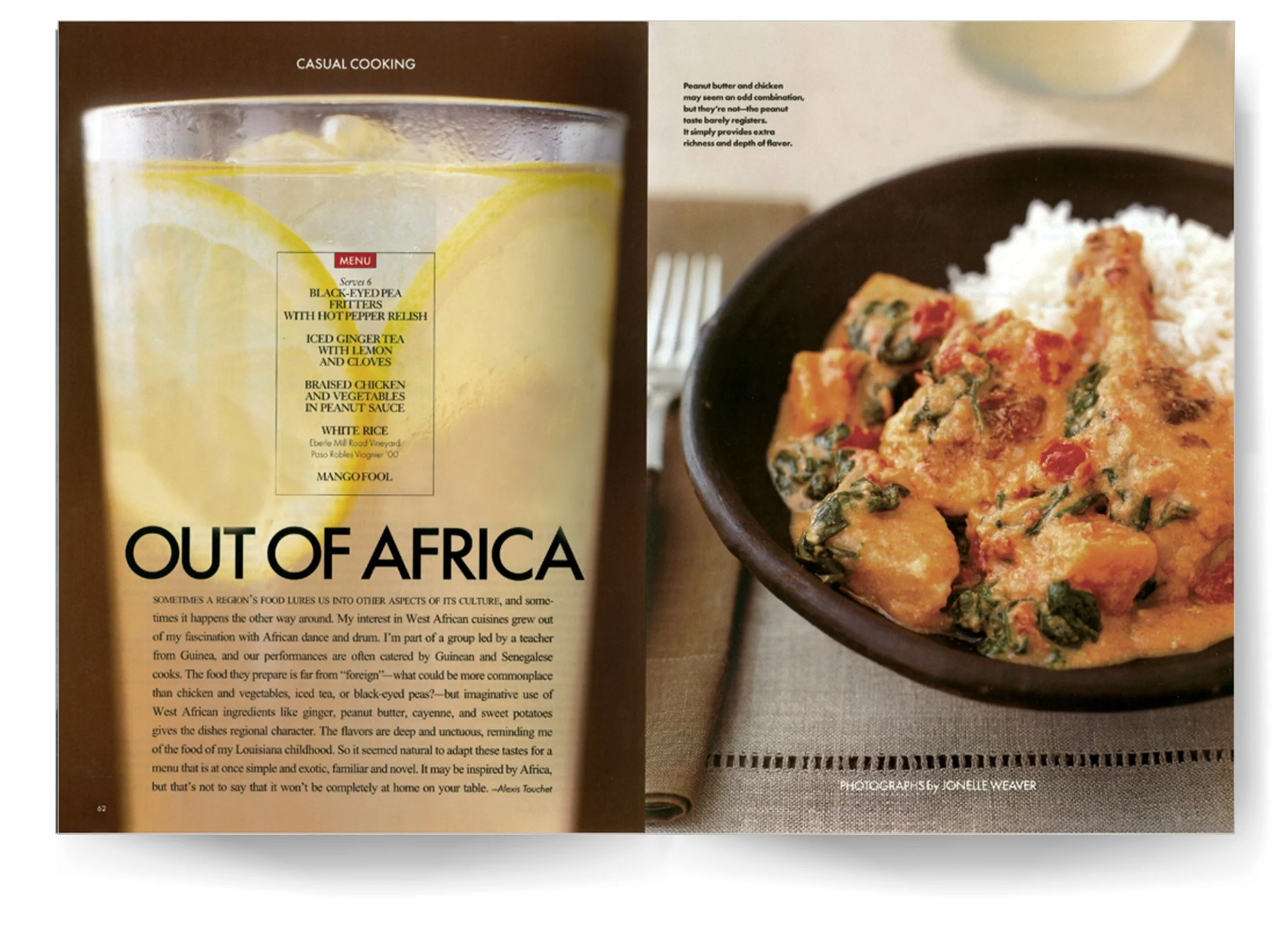 OUT OF AFRICA Beautiful food with exciting pops of color! This story speaks for itself. Even the lemonade was inspirational to me while designing. Art Director + Designer: Michele Walthers I Photographer: Jonelle Weaver I Prop Stylist: Sibella Court I Food Stylist: Kevin Crafts I Photo Director: Helen Cannavale